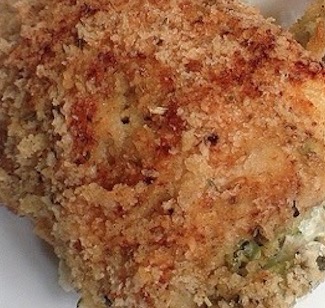 Dredge the stuffed chicken breasts first in the egg mixture, gently shake off the excess, and then dredge in the Panko. Place on baking sheet. Repeat until all stuffed chicken breasts are complete.