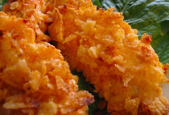 Your whole family will be fans of this chicken dish. It is covered in crushed potato chips with a little cheese and garlic powder.