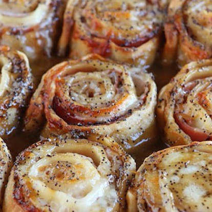 These gooey and cheesy wraps will be the hit of your party! Ham and Swiss cheese is all wrapped up in pizza dough and then topped off with a wonderful brown sugar glaze and then they are baked. But why wait for a party? Serve these gems for lunch or dinne