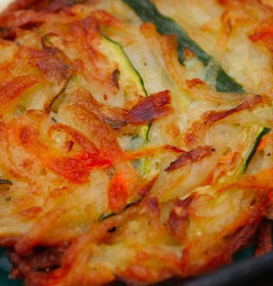 In a small bowl, mix together flour, baking powder, cumin, salt and pepper. Mix into the vegetables.