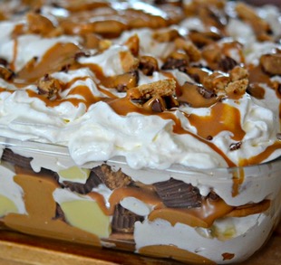 No-bake desserts are great. They save time and energy, including your own energy! This layered dessert combines all of the great sweet tastes that people love, like peanut butter, whipped cream, vanilla pudding and Peanut Butter cups. Mmmmmm.