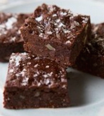 Whisk together cocoa powder, flour and salt in a separate bowl. Gently stir this flour mixture into the wet ingredients. Mix by hand, just until combined, but do not over-mix. Stir in the chocolate chips and walnuts. Pour batter into the prepared pan. Sprinkle with the flaky sea salt.