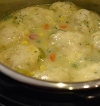 Make the dumplings about 30 minutes before the cook time is up. Add milk to the Bisquick mix; knead the dough. Add chives. The consistency should be slightly gummy but not too wet.