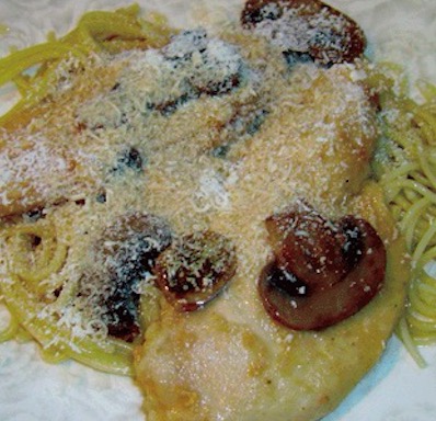 This Italian American dish satisfies your hunger cravings. It's made with chicken, Marsala wine, pasta, mushrooms topped with several cheeses and a brown butter sauce.