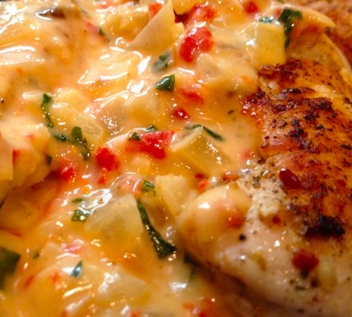 Add chicken back to skillet with any juices on the plate and simmer, covered, until just cooked through, 4 - 5 minutes. Transfer chicken to a platter and keep warm, loosely covered with foil. Stir cream and 4 T. basil into sauce in skillet; bring to a simmer.