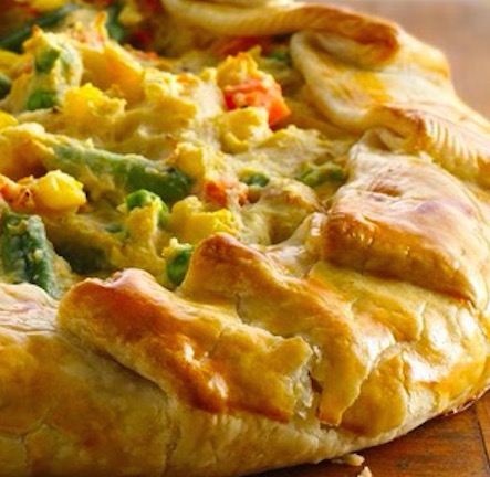 Spoon 1 cup prepared mashed potatoes in the center of each crust, spreading to within 2 inches of the edge. Top with the soup mixture, dividing evenly between the crusts. Fold crust over edge to form a 2 inch border, pleating crust as necessary. Brush crust with beaten egg.