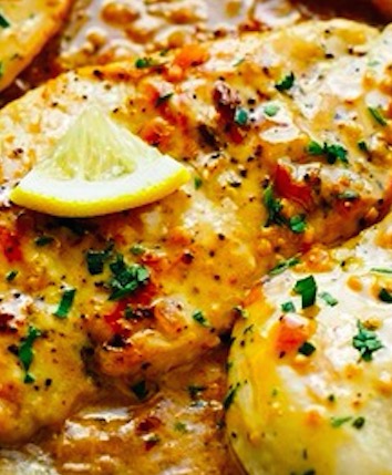 Chicken with Lemon Garlic Cream Sauce in a Skillet