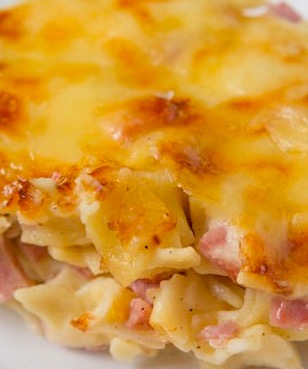 Transfer the mixture to a heat-proof dish. Sprinkle on grated cheese or place the slices of Havarti on the top. Put in the oven; bake 30 minutes. The top should be slightly golden and bubbling, when done.