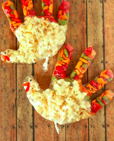 Make Thanksgiving more fun for the kiddos with these cute snack bags. The only cooking needed is popping the corn. Just fill the gloves with the popped corn and goldfish crackers, tie shut and glue on the beak and eyes! It's a fun little craft to do with