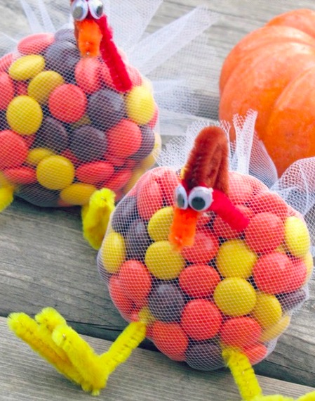 Place candies in the middle of the tulle circles; close securely with the elastic bands. Leave enough excess tulle to form the “feathers” in the back.