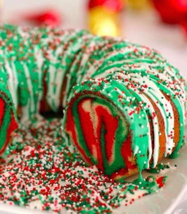With a spoon, drizzle the white frosting back and forth around the whole ring in a striping pattern until all of the frosting is gone, then microwave the other bowl. Before drizzling this over cake, mix in a few drops of green food coloring. Then drizzle frosting over the cake, scattering back and forth in the same type of striping pattern. Set cake aside to dry, then serve.