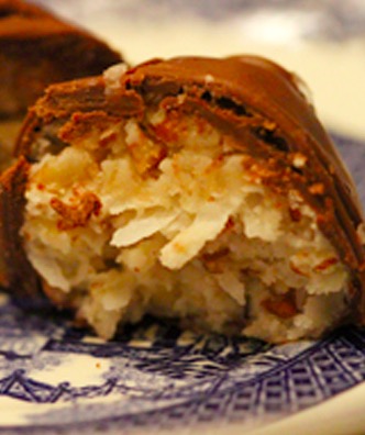 Once thoroughly chilled, dip balls in melted chocolate flavored almond bark. Place back on the cookie sheet lined with wax paper; cool.