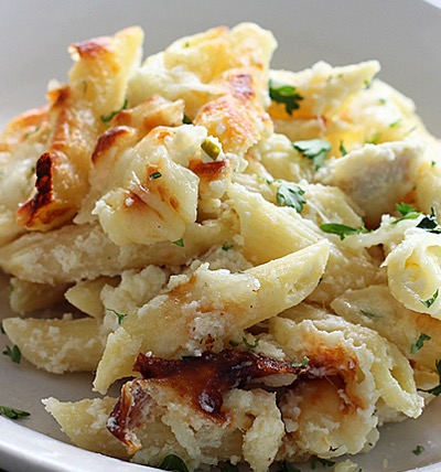 You'll love the gooey goodness of the cheesy sauce in this chicken dish. It's super quick and easy if you use rotisserie chicken and your favorite store bought Alfredo sauce.