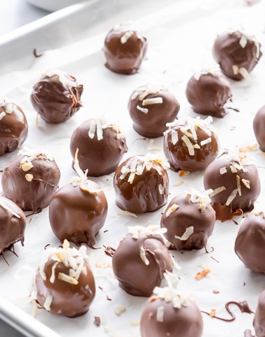 Once all caramel balls are dipped, heat the remaining chocolate and dip the balls again. Sprinkle the reserved coconut on top before the chocolate dries. Let dry.
