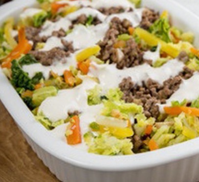 Combine lettuce, carrots and bell pepper in a large serving bowl; toss together. Add browned beef to the mix; drizzle lime crema on the top.