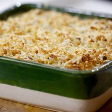 This isn't your typical tuna casserole. It is elevated a bit with sherry and soy sauce, with a Cheddar cheese and bread crumb topping that is to die for!