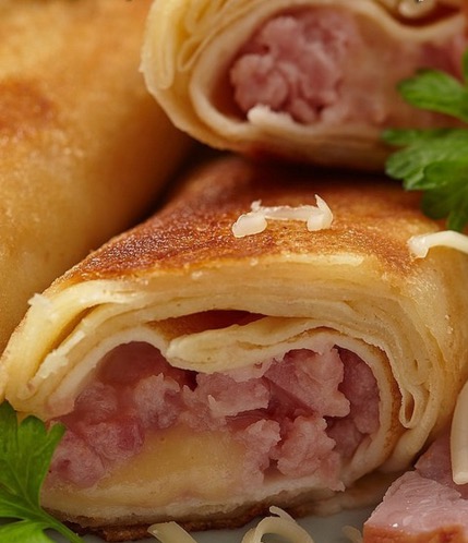 When all crepes are finished, place 1 ham slice and 1 cheese slice into the center of each crepe, fold sides in and then roll up.