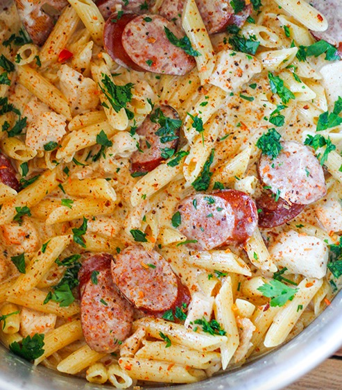 One Pot Cajun Chicken and Smoked Sausage Alfredo Pasta
