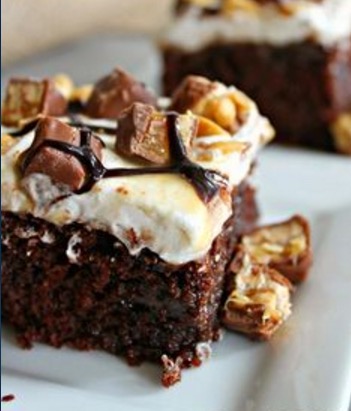 When the cake has cooled completely, remove it from the refrigerator and spread the Cool Whip over the top of the cake, spreading it evenly over the top. Drizzle on chocolate syrup; garnish with the chopped Snickers bars.