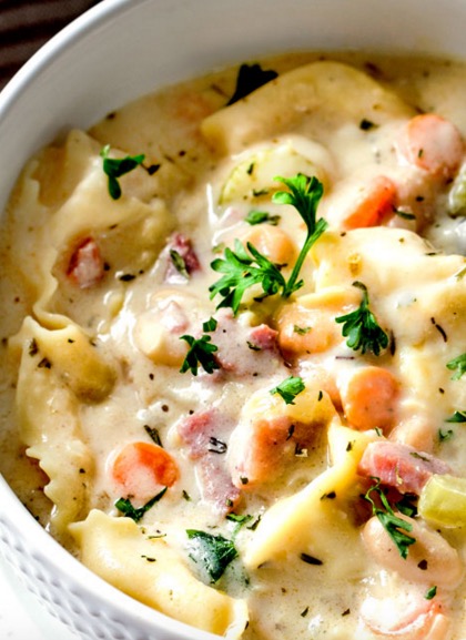 There is still enough cold weather ahead to enjoy this wonderfully creamy, delicious soup. It is full of veggies, chunks of ham and pillows of cheesy tortellini. Serve with a crusty bread and a salad.