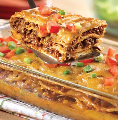 Update your boring Italian lasagna with this Mexican lasagna. Leave out the lasagna noodles and use tortillas, and make it burst with flavor using fajita or taco seasoning mix, other spices and condensed soups. Top it all off with sour cream, guacamole, c