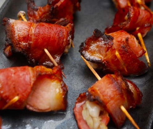 Angels on Horseback is a hot hors d'œuvre originally from the United Kingdom, made from oysters wrapped with bacon. You will get a 2 thumbs up when you serve this very special dish to company.
