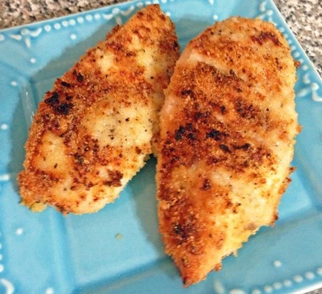In a medium shallow bowl, combine the Parmesan cheese and panko; dredge chicken in the panko mixture, coating evenly and heavily, and pressing the coating into the meat.