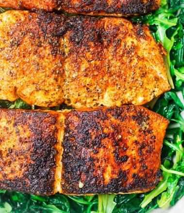 Pat the salmon fillets dry with paper towels; season on both sides with the spice mix; set aside.