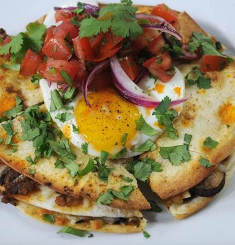 Hashbrown and Mushroom Quesadilla with Fried Egg and Salsa