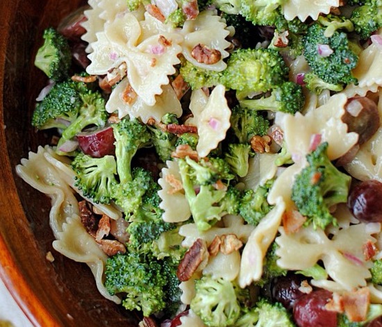 Whisk together mayonnaise, sugar, onion, vinegar and salt in a large bowl; add broccoli, hot cooked, drained pasta, and grapes; stir to coat. Cover; chill 3 hours.