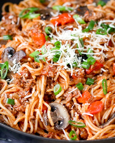 Make a quick, delicious one pot meal for those rushed weeknight meals. It has ground beef, pasta, mushrooms, garlic, onion, bell pepper and tomatoes. Add a salad and crusty bread to complete the meal.