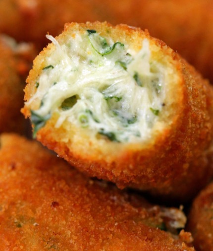 Place flour, eggs, and breadcrumbs into 3 separate bowls. Dip spinach dip sticks into the flour, then eggs, then breadcrumbs, then back into eggs, and finally back into the breadcrumbs. Set the breaded sticks aside on a platter.