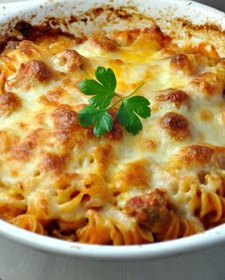This pasta dish is super easy to make, you don't even have to cook the pasta first. Just dump the ingredients in a baking dish, stir and bake. That's it. And to make it even better, clean up is a breeze!