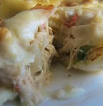 When everything has combined and cooled, stuff shells with chicken mixture; lay in bottom of a lightly greased 13 x 9 inch baking dish.