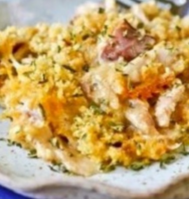 Need an easy to make casserole for your busy nights? This one is simple to make and filling. It's warm and gooey, made with layers of chicken, ham and cheese in a wonderful sauce and then is finished with a crunchy breadcrumb topping.