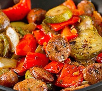 Heat oil over medium-high heat. Add sausage chunks; cook until the sausage is heated through (if pre-cooked, they just need to be heated to 165 degrees). Remove sausage from the pan; add a bit more oil, if necessary. Cook veggies about 10 minutes, or until tender. Add cooked sausage back to the pan. Stir in Italian dressing; cook for a few minutes.