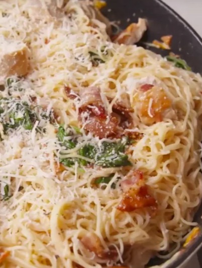 This hearty pasta dish is loaded with sautéed chicken breasts and crispy bacon. It is so delicious, it will please even the pickiest eaters.
