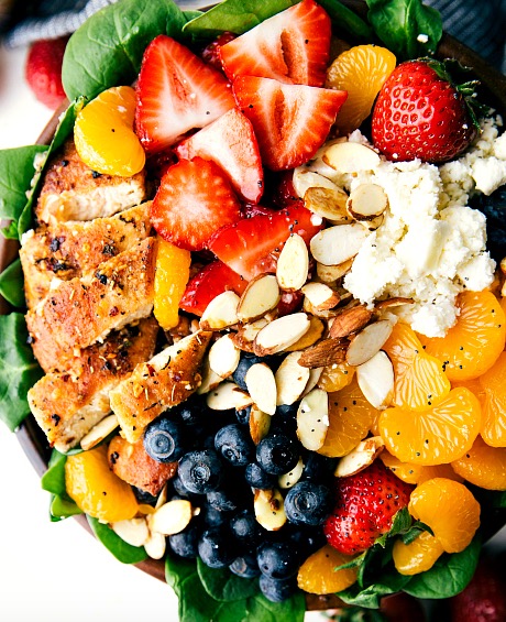 This gorgeous salad makes a perfect lunch in the spring and summer. It is simple to make and very healthy. It's a spinach salad with blueberries, strawberries, mandarin or clementine oranges, chicken, feta cheese and toasted almonds and finished off with