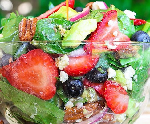 You will definitely want to try this delicious strawberry spinach salad. It is packed with spinach, strawberries, blueberries and avocado, candied pecans all served with a great tasting dressing.