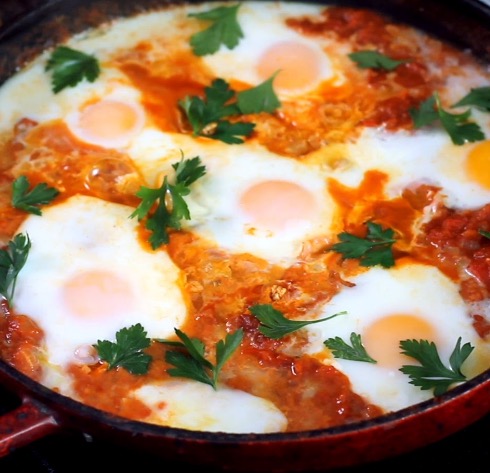 This is an amazing breakfast in many Mediterranean countries. It's poached eggs in a sauce of tomatoes with amazing seasonings like paprika, ground cumin, bay leaf and ground caraway. Serve with a crusty bread or roll to sop up that wonderful sauce.