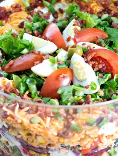This salad will feed a crowd as a side salad. It is packed with so many goodies, it can also be served as a main dish. It is fabulous tasting and is so beautiful, it will make your mouth water just looking at it.