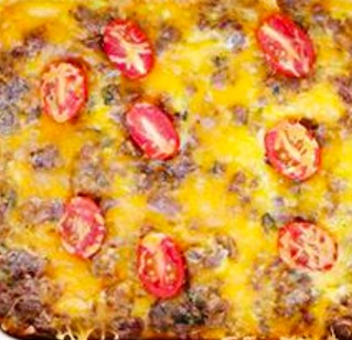 Place hash browns in the casserole dish; pour milk mixture evenly over the hash browns. Cover the hash brown mixture with the ground beef mixture. Top with thin slices of cheese and cherry tomatoes.