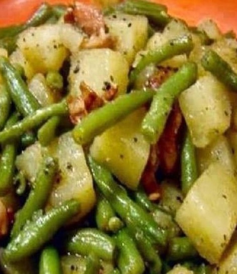 Wash green beans, drain, discard the ends and snap into pieces. Scrub the potatoes and dice. (Peel if desired.) Dice the ham. Peel and dice the onion.