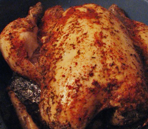 Combine all dry ingredients; rub these dry ingredients all over the chicken, inside and out.