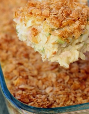 Stir crushed cornflakes and melted butter together; sprinkle over casserole mixture.