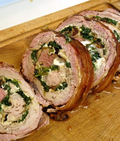 This cheese, bacon, spinach and mushroom stuffed pork tenderloin is so delicious and special, you can serve it it for special occasions and holidays. Serve with your favorite potatoes and a salad.