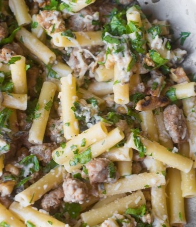 You will want to pick up a fork and dig in before this dish is completely done. It's a comforting, satisfying pasta meal with sausage, cream, lemon juice, Asiago cheese, crunchy walnuts, parsley and sage in a browned butter sauce. Don't leave out the sage