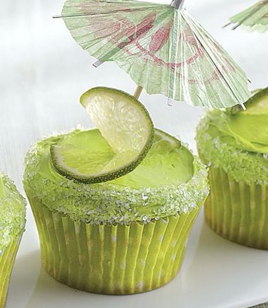 Frost cupcakes. Sprinkle sugar on a small plate; roll just the edges of the cupcakes in the sugar. Cut a small slit in lime slices; twist and place on cupcakes. Poke 1 umbrella into each cupcake.