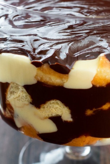 ***If wanting to serve before the ganache hardens, prepare the custard in advance, cover and chill. Assemble the trifle right before serving, so the warm ganache will maintain a gooey texture.