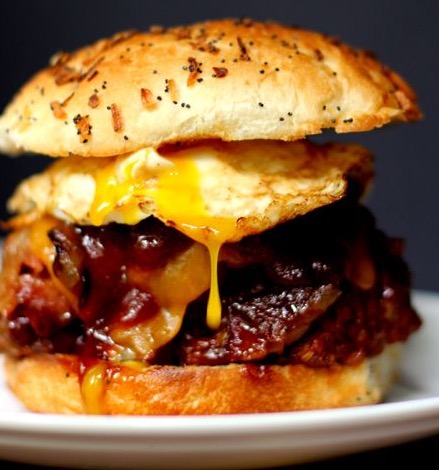 Meatloaf sandwiches don't get any better than this. It's a decadent meatloaf which is grilled with bacon slices and then the meatloaf is sliced and placed on toasted rolls with melted cheese, BBQ sauce, onions which have been sweated in bourbon, and an eg